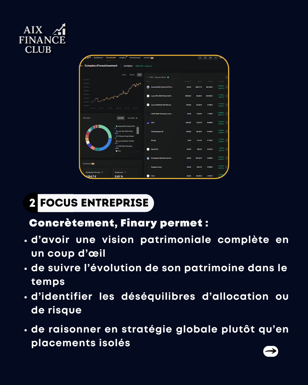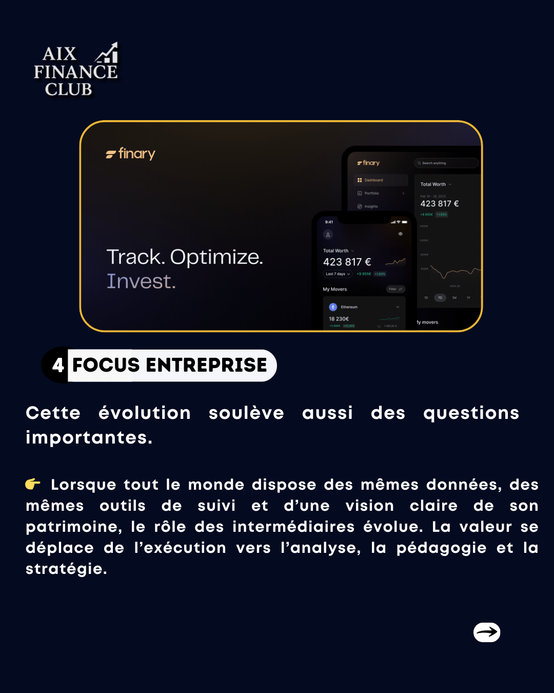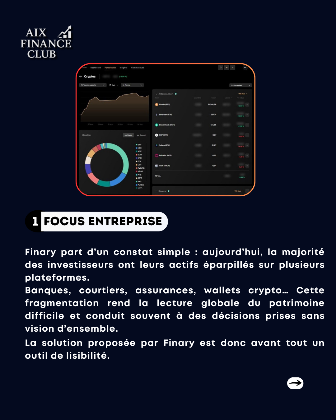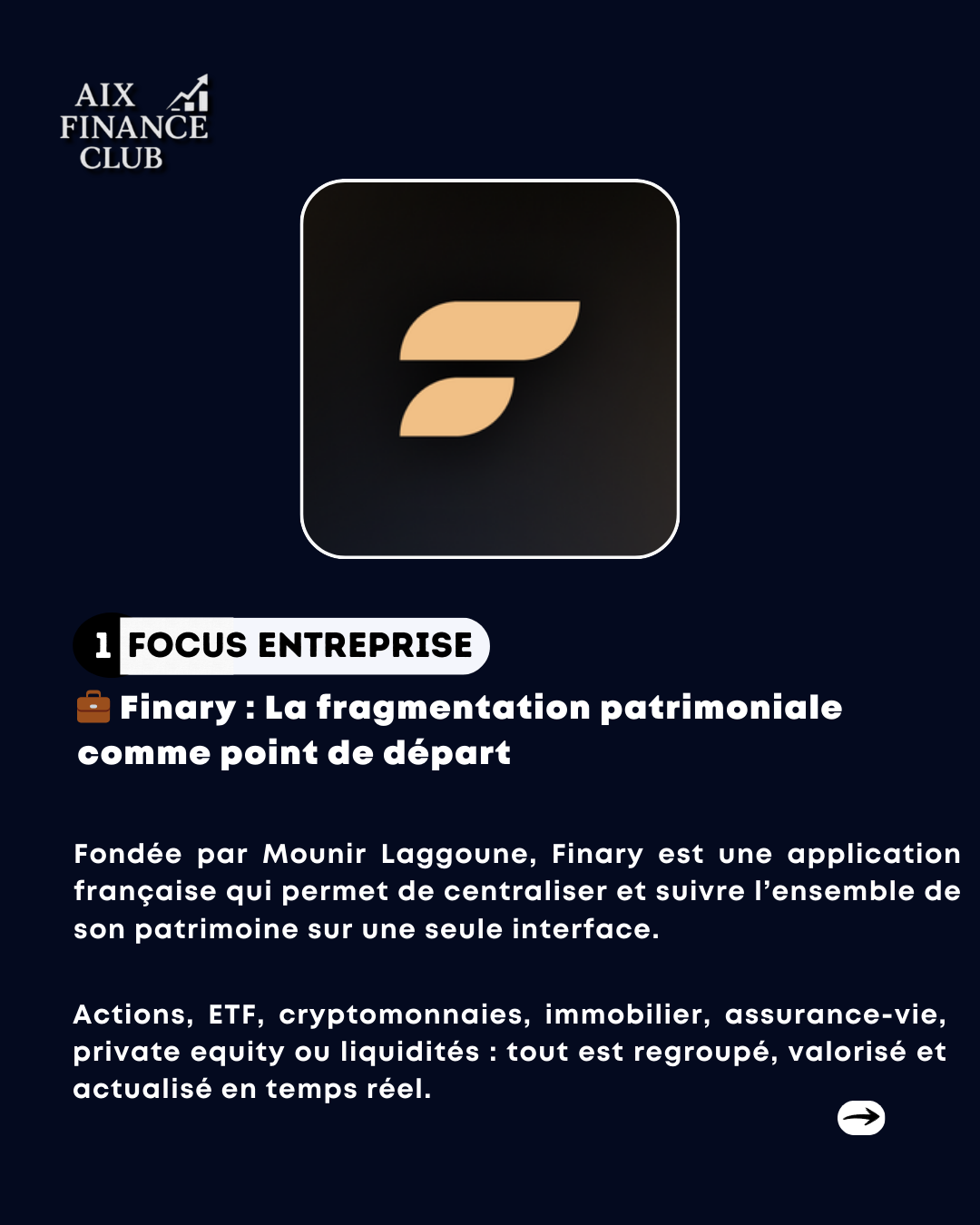 Finary développe une plateforme française qui centralise et pilote l’ensemble du patrimoine financier des particuliers et investisseurs, en combinant agrégation d’actifs, suivi de performance et outils d’aide à la décision. Comptes bancaires, PEA, assurance-vie, crypto, immobilier, private equity : une vision globale, en temps réel, pensée pour reprendre le contrôle sur ses investissements… et repenser la manière dont on gère son patrimoine. 👉 Swipez pour découvrir comment Finary transforme la gestion patrimoniale et démocratise l’accès à une vision financière professionnelle.
